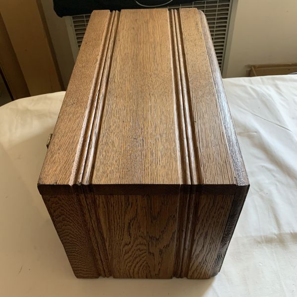 We refer to this style of tank an Eastlake” tank. this one’s made of Ash, we suspect, and it’s been refinished. there are some spots of fill on the right-side base, see the photos in the gallery. The bottom does show some water staining, there’s nothing we can do about this. This tank measures 21 5/8″ wide, 10 3/4″ tall, and extends from the wall 10 3/4″. We will install the interior “guts”, and they will come in your choice of 5 finishes.