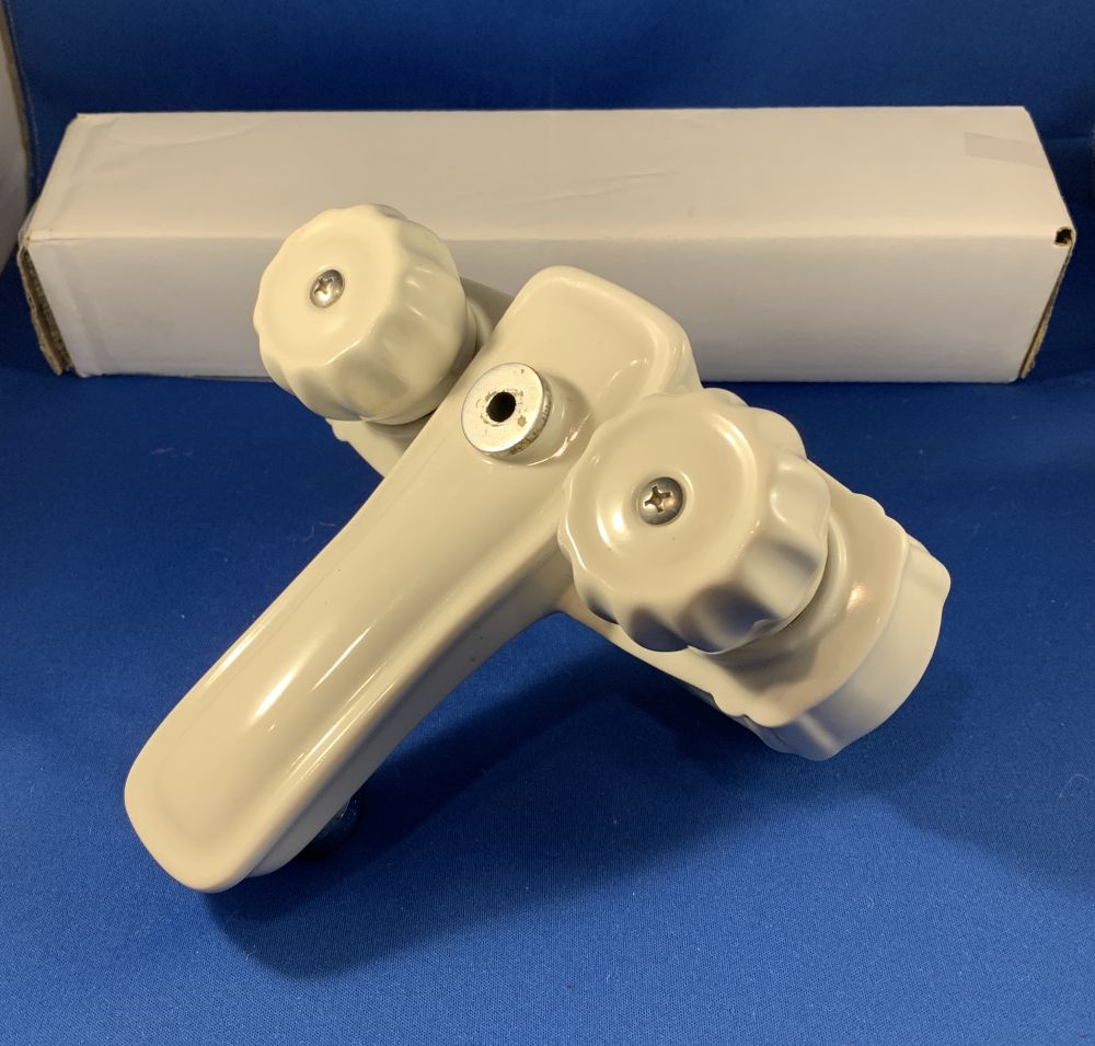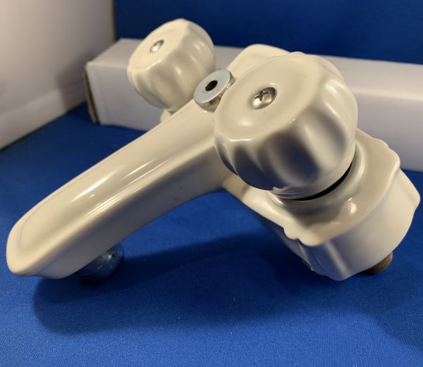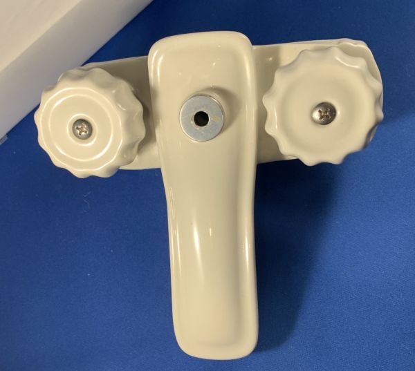 We’re not sure the maker of this faucet, but it’s certainly quite different! While it’ll mount on the common 4″ center faucet mounting holes, the entire faucet body and handles are white ceramic. Yes, buried inside is a metal valve body, but it’s hardly exposed. We went ahead and rebuild the faucet, and we will be supplying a new pop-up drain in matching (to the aerator) chrome. One only!